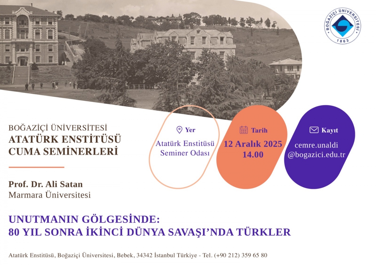 Prof. Dr. Ali Satan’ın 12 Aralık 2025 Cuma günü saat 14.00'da, Boğaziçi Üniversitesi Atatürk Enstitüsü'nde gerçekleştireceği “Unutmanın Gölgesinde: 80 Yıl Sonra İkinci Dünya Savaşı’nda Türkler” isimli konuşmasına davetlisiniz. Seminere üniversite dışından katılmak isteyenlerin 11 Aralık 2025 Perşembe günü mesai bitimine kadar cemre.unaldi@bogazici.edu.tr adresine e-mail atmaları gerekmektedir.